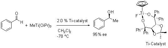 The addition of alkyl nucleophile to aldehydes can be accomplished with high optical purity. For an example, the chiral cyclpentadienyltitanium fluoride complex catalyzes the addition of methyltitanium triisopropoxide to benzaldehdye with excellent enantioselectivity (Scheme 7).