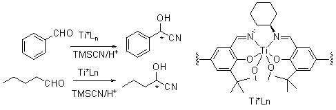 The synthesis of cyanohydrins can be achieved with high optical purity using chiral titanium-polymer complex (Scheme 8). In these reactions, the catalyst catalyzes the reactions under homogeneous conditions, however, after completion, the catalyst can be precipitated from the reaction mixture and collected for recyclability without loss of activity and selectivity using MeOH. This catalytic system has the advantages of both homogeneous as well as heterogeneous processes.
