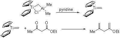Tebbe's reagent, (η5 -C5 H5 )2 TiCH2 ClAlMe2 , allows even less reactive carbonyl compounds to be transformed to the corresponding methylene compounds in the presence of pyridine. The reagent is prepared by the reaction of titanocene dichloride with trimethyl aluminium in toluene (Scheme 15).