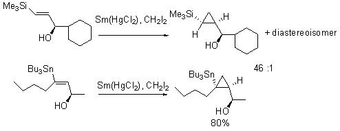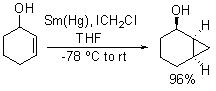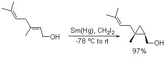 Directed cyclopropanation of allylic alcohols can be efficiently accomplished using Sm(Hg) and dihalomethane under mild conditions (Scheme 2). Many functional groups such as isolated alkenes, homoallylic alcohols are inert under these conditions. Compared to Simmons-Smith and related reagents, the present protocol performs the cyclopropanation stereospecifically. For example, cyclopropanation of geraniol can be accomplished with complete stereospecificity in excellent yield (Scheme 3).