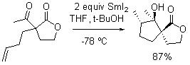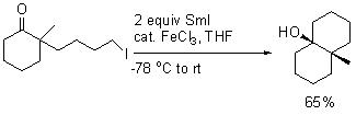 Ketyl radicals generated from reduction of ketones or aldehydes with SmI2 can be coupled both inter- and intramolecularly to a variety of alkenic species. Excellent diastereoselectivities are accomplished in intramolecular coupling reactions. For example, ketone–alkene cyclization can be pursued in a stereocontrolled manner (Scheme 12).
