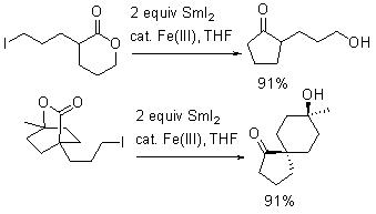 The above described reaction conditions can be used to facilitate the selective intramolecular acyl substitution of halo esters (Scheme 11). Unlike the organolithium reagents, SmI-promoted nucleophilic substitutions don't proceed with double addition to the carbonyl.