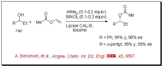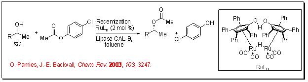 The use of lipase for the resolution of racemic alcohols is a widely known technology. However, this method gives the product with maximum up to 50% yield. This limitation can be overcome by coupling the lipase-catalyzed enantioselective resolution with a racemization of the alcohol substrate, thus obtaining a dynamic kinetic resolution process. The latter process can be pursued employing a nonchiral metal complex as a catalyst. For example, using the combination of Ru complex and CAL-B, the acylation of racemic alcohol can be accomplished with 78-92% yield and 99% ee (Scheme 1).