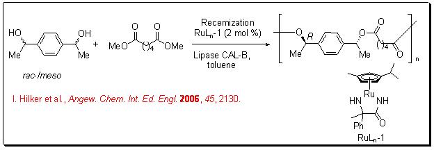 This methodology has been subsequently utilized for the enantio- and diastereoselective synthesis of chiral polymers. For example, dimethyl adipate reacts with a mixture of racemic and meso -alcohols to give chiral polyester (Scheme 2). Ru complex acts as a racemization catalyst in combination with lipase CAL-B as biocatalyst for the resolution.