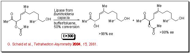 Lipases are also suitable for the resolution of complex molecules having more than one additional functional group. For example, acyloin acetate can be hydrolyzed with E > 300 leading to diol in excellent enantioselectivity (Scheme 8).