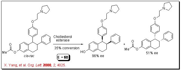 Hydrolases can also recognize “remote chiral centers”. For example, ester group separated from the stereogenic center by an aromatic group proceeds hydrolysis with enantioselectivity having the E value of 60 (Scheme 9). The product, Lasofoxifene ( cis ), is a potent and selective estrogen receptor modulator.