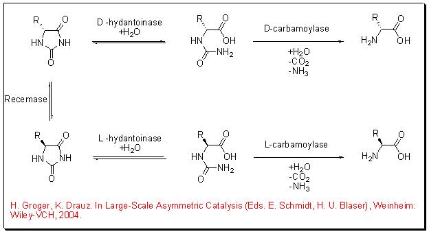 Hydantoinases and carbamoylases hydrolyses racemic hydantoins to give optically pure α -amino acids (Scheme 12). In the beginning, the hydantoinase catalyzes the hydrolytic ring opening of the hydantoin to give an N -carbamoyl amino acid that proceeds cleavage to give the desired α -amino acid.