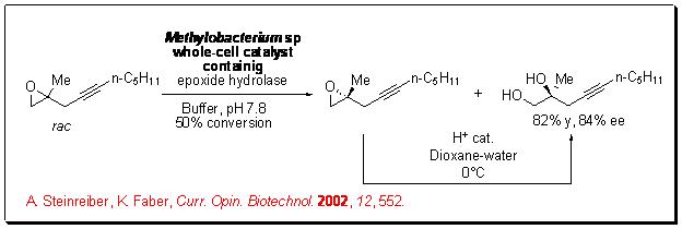 Hydrolysis of racemic epoxide using epoxide hydrolase proceeds with high enantioselectivity. For example, the resolution of aliphatic epoxide having functional group can be accomplished using Methylobacterium sp. with good enantioselectivity (Scheme 13).