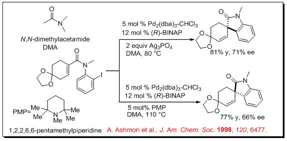 The intramolecular Heck reaction finds wide applications in organic synthesis. Among those applications the synthesis of optically active oxindoles having a quaternary asymmetric center has been considerably explored. Because the oxindole moiety serves as useful synthetic intermediate in the synthesis of numerous natural products. For example, (E)- α,β -unsaturated-2-iodoanilide undergoes cyclization in the presence of Pd2 (dba)3-CHCl3 and (R)-BINAP to give oxindoles with (S) or (R) configuration under cationic and neutral conditions, respectively. It is noteworthy that a dramatic switching in the direction of asymmetric induction has been observed between the two conditions even though the same chiral ligand (R)-BIANP is employed. In these reactions, Ag3PO4 and PMP act as HI scavenger.