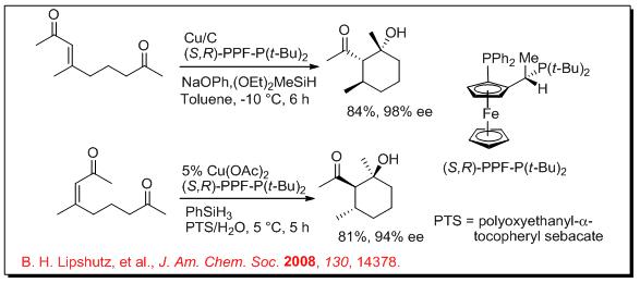 CuH is found to be highly efficient catalyst for the asymmetric reductive aldol cyclization of keto-enones to give the target product as a singly diastereoisomer with high enantiopuritiy (Scheme 8). These reactions use ferrocenylphosphines, (S, R)-PPE-P(t -Bu)2, as effective chiral ligands in the presence of silane as a hydride source (Scheme 8). These reactions can also be carried out under heterogeneous as well as aqueous conditions with surfactant.