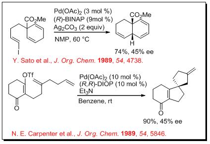The palladium-catalyzed cross-coupling reactions of aryl or alkenyl halides with alkenes in the presence of base are among the powerful reactions in organic synthesis to construct carbon-carbon bonds. The asymmetric version of the reaction is also well explored. Scheme 9-12 illustrates some examples for the intramolecular and intermolecular Heck reactions. In 1970, the Heck reaction was discovered and, in 1989, the first example of asymmetric intramolecular Heck reactions appeared using Pd(OAc)2 with (R)-BINAP with moderate enantioselectivity (Scheme 9).