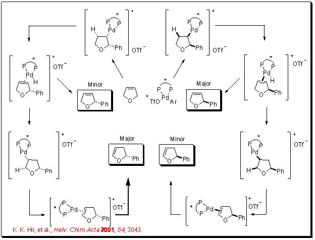 Intermolecular Heck reaction is also well studied. For example, dihydrofuran reacts with phenyl triflate to give 2-phenyl-2,3-dihydrofuran along with small amount 2-phenyl-2,5-dihydrofuran in the presence of Pd-BINAP with excellent enantioselectivity (Scheme 12). A mechanism has been proposed to explain the high enantioselectivity of the major product and inversion configuration of the minor product (Scheme 13). It involves a kinetic resolution process that enhances the enantioselectivity of the major product.