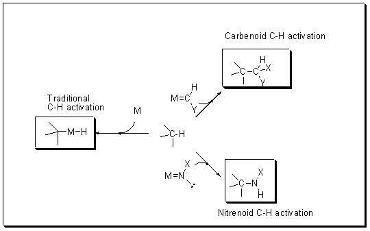Functionalization of C-H bonds constitutes an attractive approach for the direct synthesis of complex organic molecules such as pharmaceuticals, natural products, and other industrially relevant targets. Thus, much effort has been devoted to achieve practical, catalytic and selective methods for the C-H functionalization. Scheme 1 presents the two major directions evolved for the C-H functionalization process: (i) direct C-H activation involving oxidative addition to the C-H bond onto an active metal center, and (ii) insertion of transition metal-coordinated carbenes or nitrenes into the C-H bond to give functionalized products.