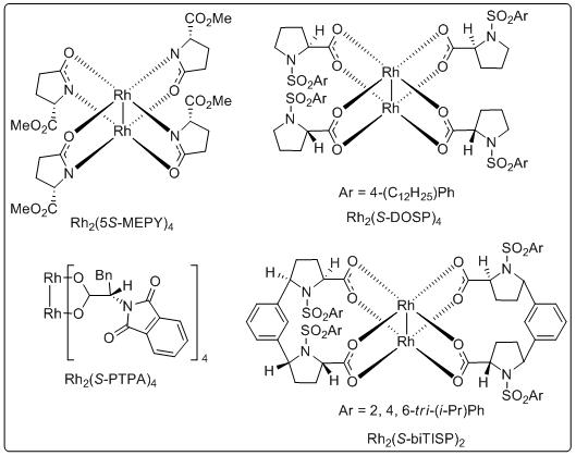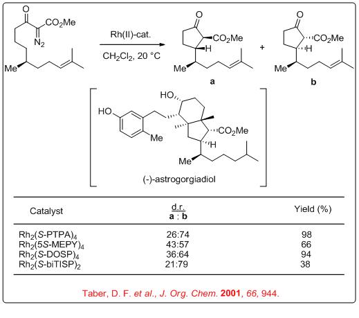 For example, chiral dirhodium complexes catalyze the intramolecular C-H insertion of α -diazo -β -ketoester to give the intermediate for the total synthesis of the marine secosteroid (-)-astrogorgiadiol (Scheme 3). Up to 58% de is observed with moderate yield of 38% employing Rh2( S -biTISP)2 as the catalyst. The reaction using Rh2 (S-PTPA)2 afforded excellent yield but with lower diastereoselectivity.