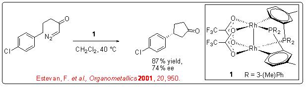 ortho -Metallated arylphosphine dirhodium(II) complexes are found to be effective catalysts for intramolecular C-H insertions of certain diazoketones (Scheme 4). One of the examples is the use of dirhodium complex 1 for the reaction of chloro-substituted system to afford cyclophentanone in 74% ee and 87% yield. This system works well with the aryl portion having electron withdrawing group.