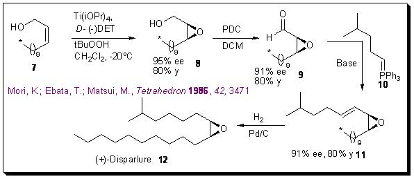 The reaction has been applied for the synthesis of a number of natural products, antibiotics and pharmaceuticals. For examples, the synthesis of the sex pheromone of gypsy moth (Lymantria dispar) (+)-disparlure 12 has been accomplished (Scheme 6). The epoxidation of allyl alcohol 7 by Sharpless procedure affords optically active epoxy alchohol 8 with 95% ee that in presence of pyridinium dichlorochromate (PDC) gives chiral aldehyde 9 . The latter with Wittig salt 10 affords trans -alkene 11 that could be reduced using Pd/C to give the target (+)-disparlure 12 .