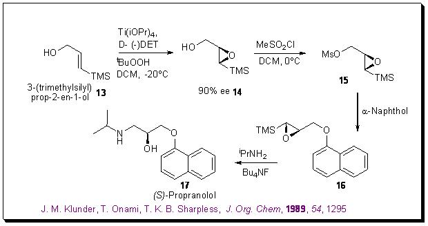 The Scheme 7 shows the use of the Sharpless asymmetric epoxidation for the synthesis of gastric inhibitor (S) -propanolol. The epoxidation of 3-(trimethylsilyl) prop-2-en-1-ol 13 affords epoxy alcohol 14 with 90% ee that could be converted into 16 by mesylation 15 followed by coupling with 1-naphthol. Opening of the epoxide 16 with isopropylamine leads to the formation of the target (S) -propanolol 17 .