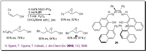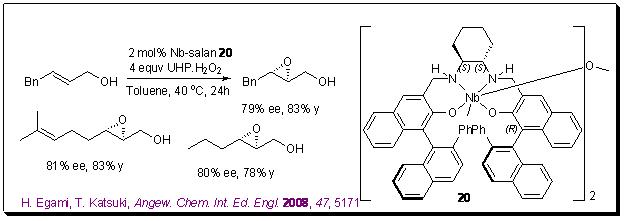 Chiral niobium-complexes catalyze the epoxidation of allylic alcohols in the presence of hydrogen peroxide (H2O2) or urea hydrogen peroxide (UHP). From environmental and economic standpoint, this process is more attractive because it is atom economical and generates water as by-product. For example, [(μ-oxo){Nb(salan)}2] 20 catalyzes the epoxidation of allylic alcohols in the presence of UHP at ambient conditions (Scheme 9-10).