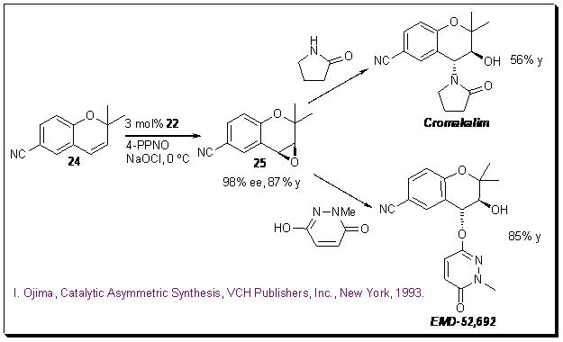 The epoxidation of 6-cyano - 2,2-dimethylchormene 24 with 22 affords 25 that can be converted into anti-hypertensive agents cromakalim and EMD-52692 by reaction with appropriate nitrogen nucleophiles (Scheme 17).