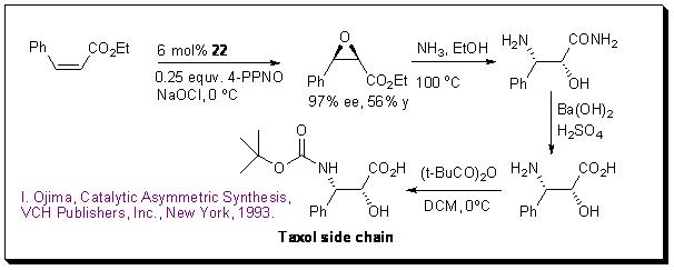 The catalyst 22 has been further utilized for the epoxidation of cis -cinnamic ester in 97% ee and 56% yield that can be converted into taxol side chain by opening of the epoxide with ammonia followed by hydrolysis and protection using (t-BuCO)2O (Scheme 18).
