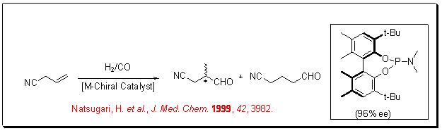 The asymmetric hydroformylation of allyl cyanide is of great interest because the iso-aldehyde derivative can be converted into 2-methyl-4-butanol, which is intermediate, for the asymmetric synthesis of tachikinin, a novel NK1 receptor agonist (Scheme 7). The reaction has been studied using diphosphite, phosphine-phosphite, bis-phosphacyclic and phosphoroamidite ligands with up to 96% ee.