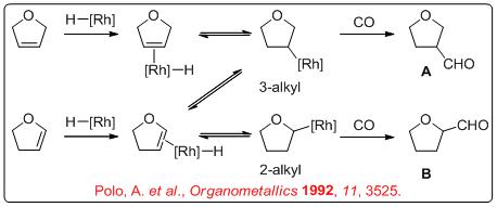 Few studies are focused on the hydroformylation of heterocyclic alkenes. For these substrates, the regioselectivity is of special interest because it is different from that of the acyclic alkenes. For example, the hydroformylation of 2,5-dihydrofuran can lead to the formation of both the tetrahydrofuran-3-carbaldehyde A (expected product) and tetrahydrofuran-2-carbaldehyde B (could be formed via an isomerization process). The regioselectivity is to be controlled by the modification of the ligands and reaction conditions.