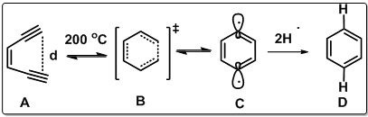 The enediynes can be synthesized via Sonogashira coupling protocol. The enediynes undergoes a key cycloaromatization reaction which is the heart at the chemistry of enediyne molecules. The Bergman cyclization or Bergman reaction or Bergman cycloaromatization is an organic reaction and more specifically a rearrangement reaction taking place when an enediyne is heated in presence of a suitable hydrogen donor (Scheme 12). It is named for the American chemist Robert George Bergman. The reaction product is a derivative of benzene.