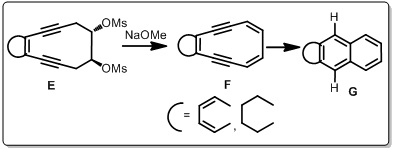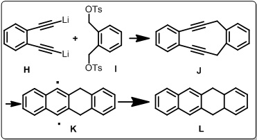 In 1980, Wong and Sondheimer observed a cycloaromatization from in situ generated cyclic enediynes e.g. (K) and postulated the intermediacy of a 1,4-diradical (Scheme 14).