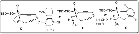 In 1989, Magnus et al. have shown that the comparatively unreactive enediyne C undergoes cyclization after removal of the C1-C2 double bond. Thus heating C at 110oC in 1,4-CHD in the presence of 4-chlorothiophenol and N-morpholine gave the aromatized product G (Scheme 31). This result convincingly demonstrate that the formation of putative 1,4-diyl can be triggered intermolecularly by thiol addition to C-2 and provides an alternative triggering device that may be exploited in the design of so called rational analogs and also the importance of double bond on the rate of cyclisation.