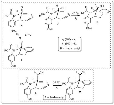 During the study of relative rates of cycloaromatization of Dynemicine azabicyclo[7.3.1]enediyne core structures, Magnus et al. showed an interesting role of hybridization of bridging carbon atom on to the cyclisation barrier. They have synthesized and studied the rates of BC of several dynemicine core structures. Thus, while distance between the bonding acetylenic carbon atoms in H and L is virtually the same, and the hybridization at the bridging carbon atoms is trigonal in both compounds, L cyclises 500 times faster than H at 37oC. They have found an even more dramatic change in rate when the bridging trigonal carbon atom is made tetrahedral. Thus reduction of H with sodium borohydride in methanol at 25oC gave directly the cycloaromatized alcohol K. Conservative estimation showed that the alcohol J cycloaromatizes 106 faster than H at 37oC (Scheme 32).