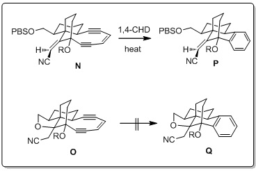 Annelation of a bicyclo [7.3.1] enediyne core has been shown by Nantz et al. to alter the cycloaromatization reactivity. The enediyne (O) containing a sp3-hybridized bridging carbon atom is resistant to cycloaromatization whereas the immediate sp2-hybridized precursor enediyne (N) readily undergoes transformation to its benzenoid counterpart (Scheme 33). This observation is just opposite to the study of Magnus but give the light about the role of hybridization on the rate of BC.