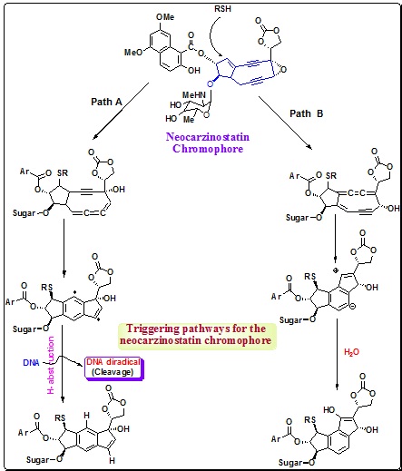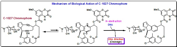 C-1027 is one of the most potent antitumor antibiotic chromoproteins. It composed of an 11-kDa apoprotein and a highly reactive chromophore. The C-1027 chromophore is in equilibrium with its active biradical form in the apoprotein and unlike NCS does not need nucleophiles or radicals for its activation. The p-benzyne biradical thus generated exerts its potent biological activity by abstracting hydrogen atoms from the sugar portion of double stranded DNA, which ultimately leads to oxidative cleavage of DNA (Scheme 5).