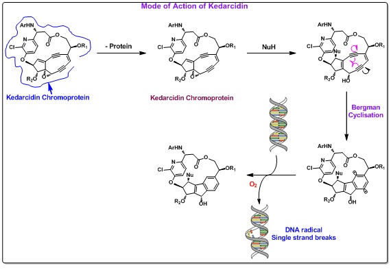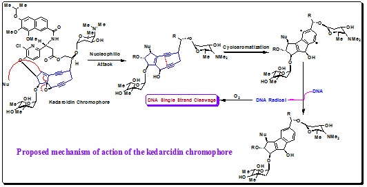 Kedarcidin is a new chromoprotein antitumor antibiotic that was isolated from the fermentation broth of a novel actinomycete strain. It consists of an apoprotein and a cytotoxic, highly labile, non protein chromophore. The apoprotein is water soluble while the chromophore is solvent-extractable, cytotoxic and highly unstable. As with NCS, the antitumor activity of kedarcidin is due primarily to the chromophore. The enediyne core is activated by chemical reduction (e.g. sodium borohydride) followed by spontaneous cyclization to a biradical intermediate and DNA cleavage (Scheme 6).
