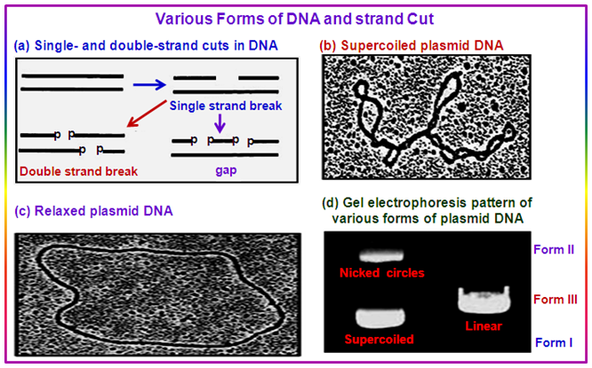 Figure 4. (a) Single- and double-strand DNA cuts. (b) Supercoiled plasmid DNA. (c) Relaxed plasmid DNA. (d) Gel electrophoresis pattern of various forms of plasmid DNA [form I : supercoiled ; form II: nicked, single-stranded (ss) cleavage ; form III: linear, double-stranded (ds) cleavage].