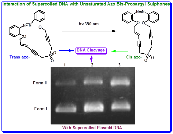 Figure 8. DNA-cleavage experiment of trans- and cis- unsaturated azo-bis-propargyl sulphone in TAE buffer (pH 8.5), and 7 μL of plasmid DNA (0.4 μm/bp). Lane 1: control DNA + CH3 CN (10 μL); Lane 2: DNA + E-sulfone (0.02 mM) in 5 μL CH3 CN; Lane 3: DNA + Z-sulfone (0.02 mM) in 5 μL CH3 CN.