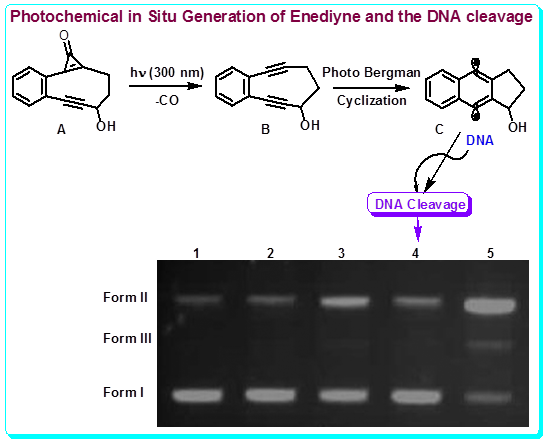 An evaluation of the photogenerated nine-membered ring enediyne B , towards nuclease activity was carried out using supercoiled plasmid DNA cleavage assays. Three forms of this DNA: native (RF I), circular relaxed (RF II, produced by single-strand cleavage), and linear (RF III, formed by scission of both strand in close proximity) are readily separated by the agarose gel electrophoresis. Aqueous solution (5 mM) of cyclopropenone A was irradiated with low-pressure mercury lamp to produce reactive enediyne B . A solution of φX174 supercoiled circular DNA (10 ng/μL) in TE buffer was added to photolysate and incubated for 16 h at 25°C.