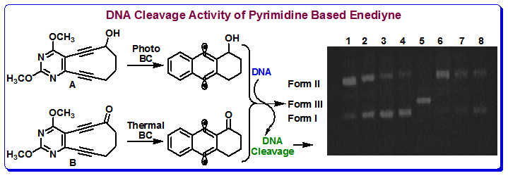 ompounds A and B cleave double-stranded DNA which is shown in Figure 10 Both of them showed this property when incubating with ΦX174 dsDNA for 70 h at 40°C. The ketone B showed significant DNA nicking (Form II) at concentrations as low as 40 μM and nearly complete nicking at 4 mM. The alcohol A showed almost no reactivity at 40 μM but was able to nick DNA at 4 mM. While no double-strand (ds) cleavage (Form III) was observed at the lower concentrations, both A and B show slight ds cleavage at 4 mM.