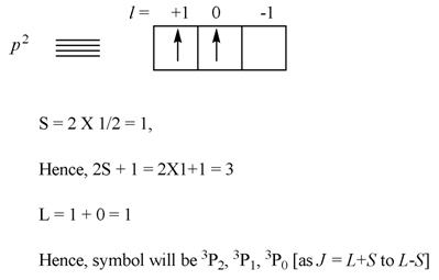 S = No. of unpaired electron(s)×1/2. L stands as, L = 0 is S , L =1 is P , L = 2 is D , L =3 is F , L = 4 is G , and so on. J is the vector sum of L and S. It varies as, J = L + S , L + S -1, L + S -2, .... L - S