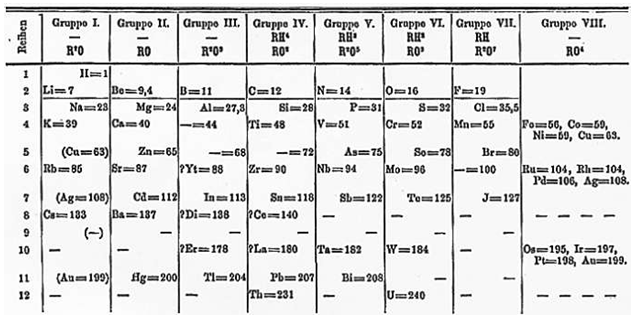 In 1869, Russian scientist Drmiti Meldeleev has tabulated then existing elements according to their atomic weight. The table is known as periodic table. According to Mendeleev, physical and chemical properties of elements are periodic functions of their atomic weights. Distributions of elements along a horizontal row forms a period, while, along a vertical column forms a group. He arranged elements into eight main groups and twelve columns according to similarities in physical and chemicals properties´ of the existing elements. Each group was subdivided into two sub groups.