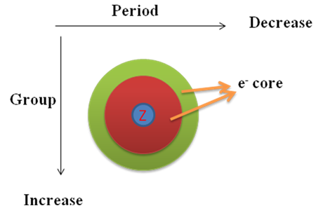 If we go down a group, additional electron occupies new orbital (let say green). Consequently, electrons are more screened by the inner core electron cloud. Hence, the effective nuclear charge on the electron cloud decreases on moving from top to bottom in a group, which causes an increase in atomic size.