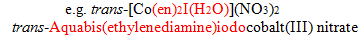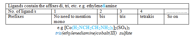 3) Names of the ligands: Negative ligands end in –o & the positive ligands end in –ium. The neutral ligands are named as such.