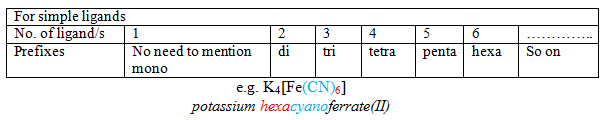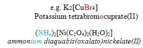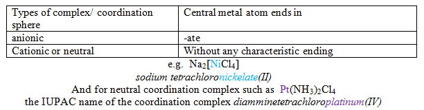 The names of neutral coordination complexes are given without spaces and for ionic coordination complexes the cation is named first & then the anion separated by a space.
