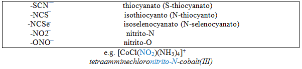 9) Point of attachment: if there is more than one atom for attachment with metal then the symbol of atom is written after the name of ligand.