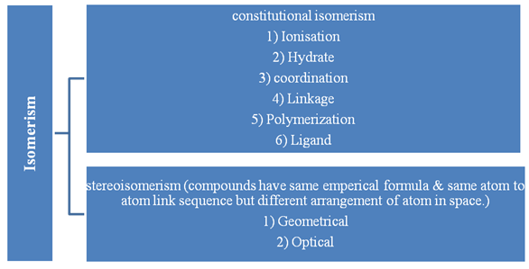 Geometric Isomerism: Geometric Isomers differ in the spatial arrangement of atoms within the same structural framework. It is also called cis- trans- isomerism.
