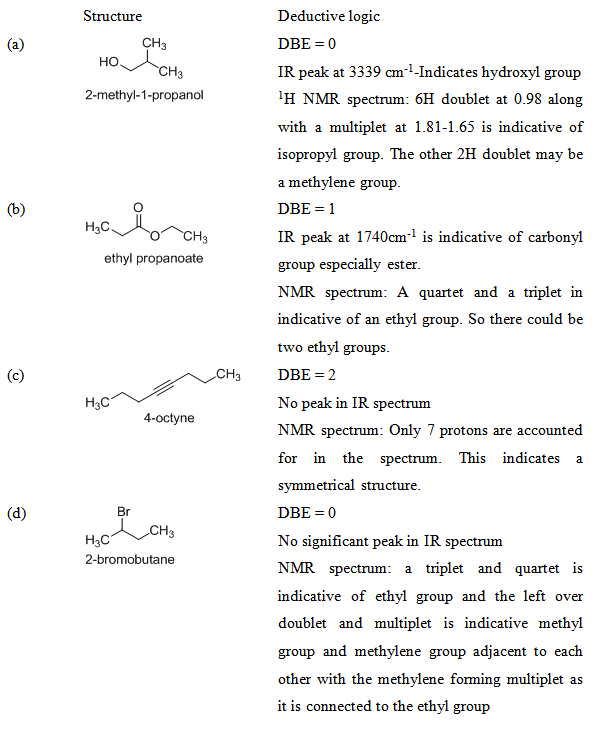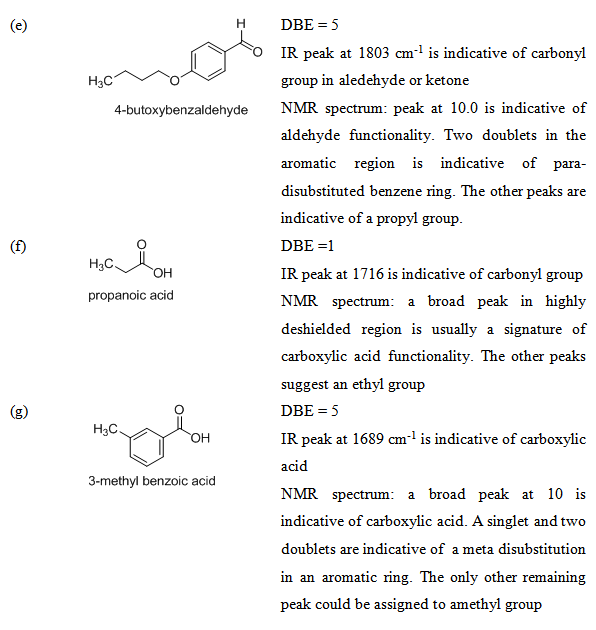 2. In this problem, the usual way of solving involves the determination of double bond equivalent (DBE) or index of unsaturation, followed by detection of any functional groups in the IR spectrum and then assigning the structure from NMR and mass spectrum.