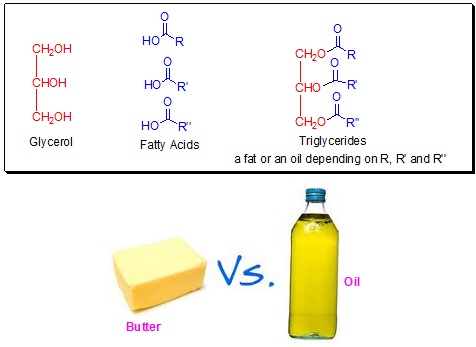 The solid or semisolid triglycerides at room temperature are called fats, while the liquid is called oil (Figure 3). Fats are generally obtained from animals, while oils come from plant products. In fats, saturated fatty acid is usually involved in the formation of ester with glycerol, whereas in oils, unsaturated fatty acid is involved. In case of fats, the saturated fatty acid chain can pack closely together causing them to be solids at room temperature. In case of oil, the unsaturated fatty acid chain can not pack tightly together, and therefore, that leads to usually have low melting points.