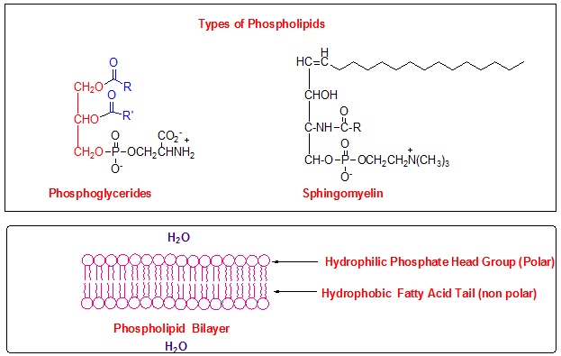 Lipids that contain a phosphate group are called phospholipids. There are two kinds of phospholipids: phosphoglycerides and sphingolipids (Scheme7). These lipids form membranes by arranging themseleves in a lipid bilayer. The polar hydrophilic groups of the phospholipids are on the outside of the bilayar , while non-polar fatty acid tail form interior of the bilayer.