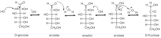 The position of carbonyl group may shift via enediol intermediate under basic condition. For example, rearrangement of D-glucose gives D-fructose (Scheme 2).