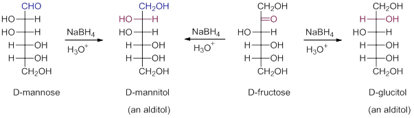 The monosaccharide contains carbonyl group which can be reduced by the reducing agents such as NaBH 4 . Reduction of aldose forms one alditol and ketose forms two alditols (Scheme 3).