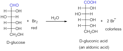- Bromine water oxidizes aldehyde functional group, but it cannot oxidize ketones or alcohols. Therefore, aldose can be distinguished from ketose by observing reddish-brown colour of bromine. The oxidized product is an aldonic acid (Scheme 4).